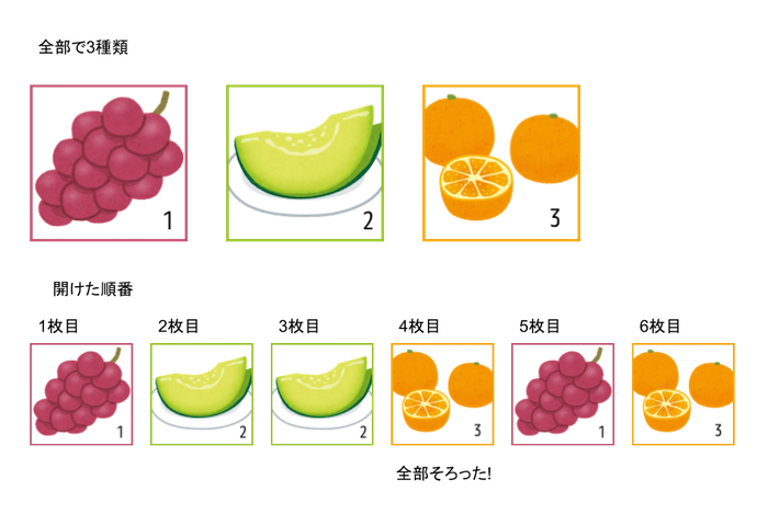期待する出力何枚開けたときに全種類そろったかを出力してください。